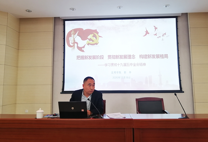 12月18日,学校党委委员、副校长郭华以“把握新发展阶段 贯彻新发展理念 构建新发展格局”为题,为学生处、人事处、图书馆、美术与艺术设计学院、化学化工学院党员干部、师生讲授专题党课。
