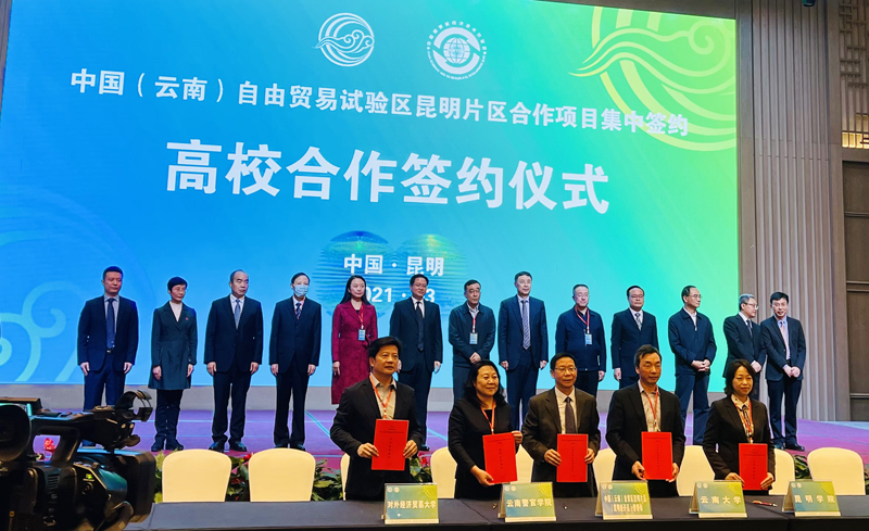 3月10日,丁文丽校长出席中国(云南)自由贸易试验区昆明片区(昆明经开区)2021年集中签约仪式,代表学校与对外经济贸易大学、中国(云南)自由贸易试验区昆明片区管委会签订三方合作框架协议。