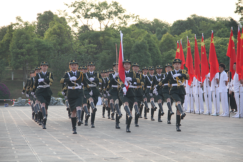 朝阳初升,欣欣向荣。国旗护卫队队员精神抖擞地迈着正步,护卫着五星红旗来到聂耳广场旗杆下。全场肃立,向五星红旗行注目礼。在庄严国歌声中,鲜艳的五星红旗冉冉上升,迎风飘扬。