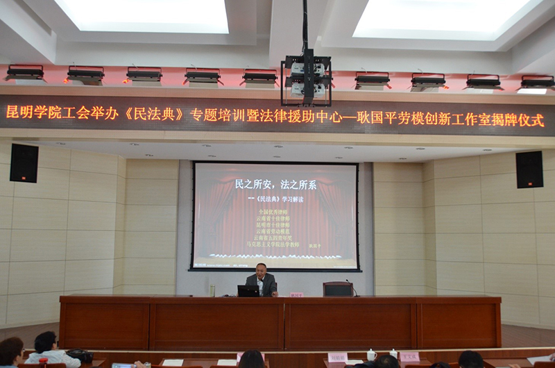 为切实加强《民法典》的学习宣传教育,提高beat365官方网站工会干部职工运用《民法典》维护教职工权益、化解矛盾纠纷、促进社会和谐稳定能力和水平,引导工会干部职工做学习、遵守、维护《民法典》的表率,运用《民法典》维护教职工权益、竭诚服务广大教职工群众。5月8日上午,在beat365官方网站办公楼3楼D区报告厅,省劳模耿国平律师为全体工会干部作《民法典》知识专题讲座,开启了劳模创新工作室第一课,同时进行了beat365官方网站洋浦校区法律咨询援助中心——耿国平劳模创新工作室揭牌仪式。