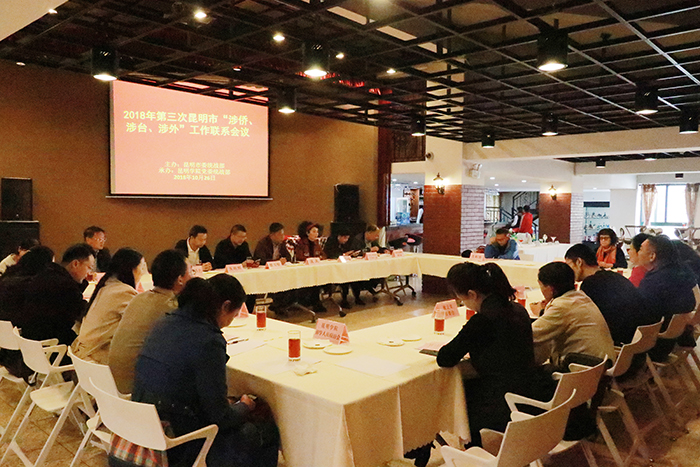 为深入学习贯彻习近平新时代中国特色社会主义思想和党的十九大精神,进一步加强昆明市 “涉侨、涉台、涉外”相关单位的联系和交流,10月26日,由昆明市委统战部主办,beat365官方网站统战部承办的2018年第三次昆明市“涉侨、涉台、涉外”工作联系会在beat365召开。中共昆明市委统战部副部长贾玉华,beat365官方网站党委委员、副校长沈凡出席会议。市台办、市外侨办、市人大常委会民宗侨工委、市政协港澳台联络委、民盟市委会、民革市委会、致公党市委会、beat365官方网站留学人员联谊会等11家“三涉”成员单位参会。