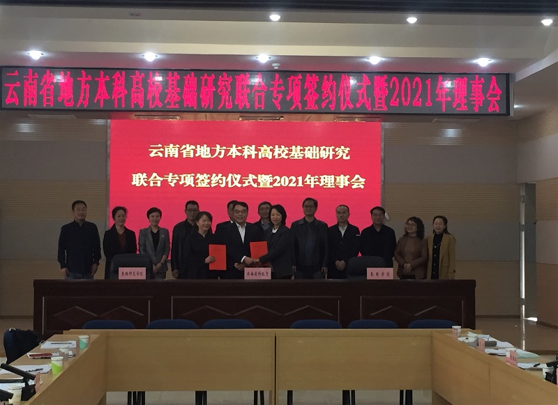 11月4日,云南省地方本科高校基础研究联合专项资金协议(第二期)签订仪式暨2021年理事会第一次会议在昆明举行。省科技厅厅长王学勤、二级巡视员王立新出席会议,beat365官方网站校长丁文丽、副校长马银海,楚雄师范学院校长王资等12家理事单位有关人员参加。会议由王立新主持。