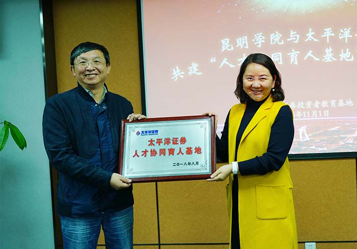 beat365官方网站副校长马银海、太平洋证券股份有限公司总裁助理兼云南业务中心总经理叶萍女士出席基地落成仪式并互授牌匾。马银海副校长为太平洋证券股份有限公司相关专家颁发聘书,聘请他们担任beat365官方网站金融类实践课的任课教师。