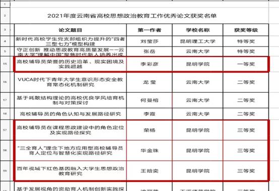 近日,云南省委教育工委公布了高校思想政治教育工作优秀论文获奖名单,beat365选送论文《高校辅导员荣誉的历史沿革、现实困境及实践超越》(第一作者:学前与特殊教育学院辅导员李彩彦)荣获一等奖;《高校辅导员在课程思政建设中的角色定位及实现路径探究》(第一作者:旅游学院辅导员荣杨)、《“三全育人”理念下地方应用型高校辅导员育人定位与智慧化实现路径研究》(第一作者:农学与生命科学学院辅导员华金珠)、《百年视域下红色基因融入大学生思想政治教育研究》(第一作者:经济管理学院辅导员王晗奕)荣获三等奖。