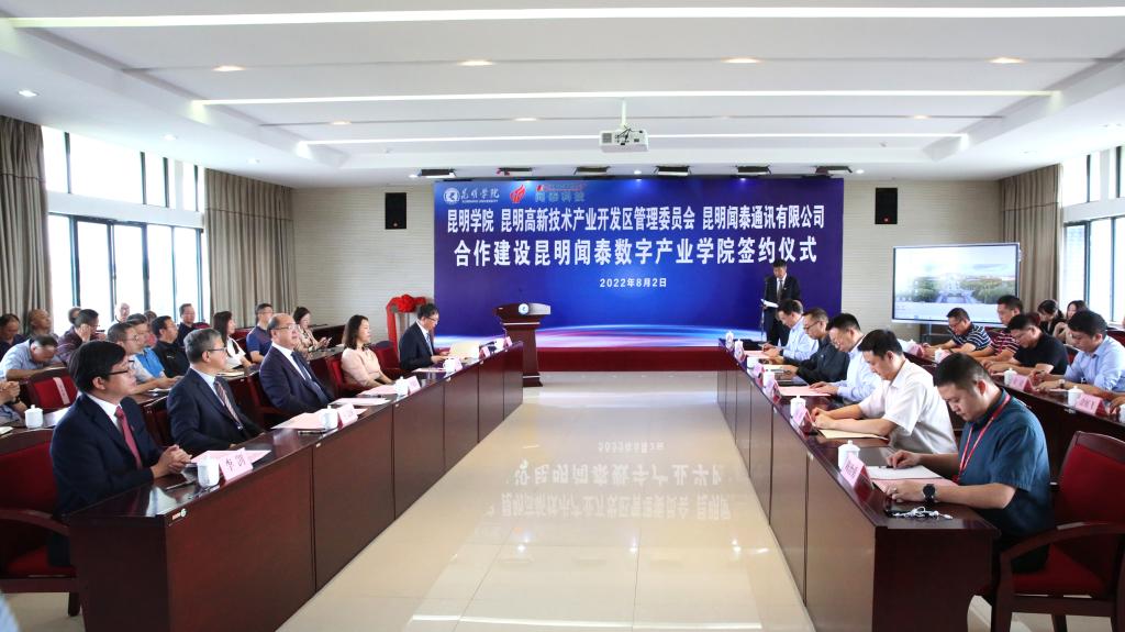 8月2日,beat365官方网站、昆明高新技术产业开发区管委会、昆明闻泰通讯有限公司全面战略合作协议签约仪式在校举行,三方将共建“昆明闻泰数字产业学院”,实现“校、地、企”人才智力优势、政策优势、产业优势强强联合,共同打造引领全省、全市数字经济发展的产业高地、科技高地和人才高地。