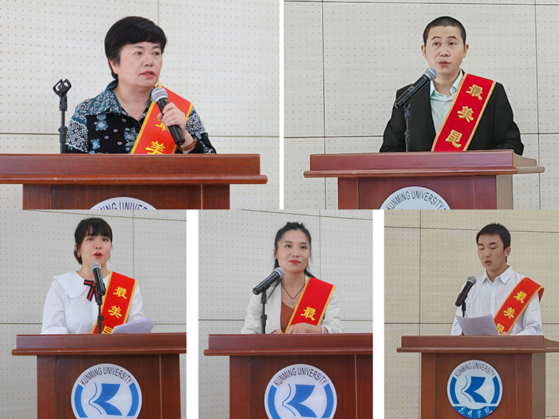 “最美昆院人”教书育人奖获奖者代表、人文学院教师孙雪莹,科研贡献奖获奖者代表、化学化工学院教师梁德强,管理服务奖获奖者代表、学前与特殊教育学院教师唐敏,优秀辅导员奖获奖者代表、旅游学院教师荣杨,优秀学子奖获奖者代表、信息工程学院学生徐章燎分别作交流发言。