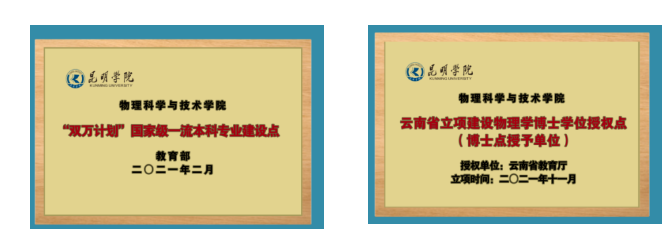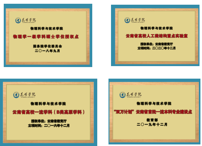 学院积极响应国家“提高基础学科教育水平,培养更多基础研究人才”的号召,主动契合国家及云南省大力发展新能源新材料、绿色能源的重大需求,着力物理学科基础研究人才培养,及超构材料、金属有机分子材料与器件、新能源材料与器件的科研创新。2016年入选“云南省高校一流学科(B类高原学科)”,2018年成功申报一级学科硕士学位授权点,2021年入选云南省立项建设物理学一级学科博士学位授权点。物理学专业2019年、2020年先后入选教育部“双万计划”省级及国家一流本科专业建设点,2022年顺利通过教育部师范专业二级认证。现有云南省重点实验室1个、云南省高校重点实验室1个、云南省高校科技创新团队1个、云南省硕士生导师团队1个、云南省职工创新工作室1个、云南省一流本科课程1门。