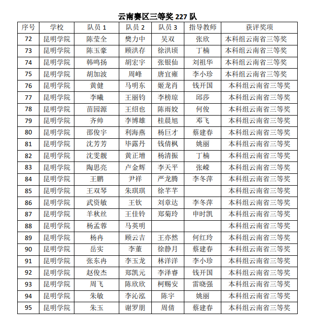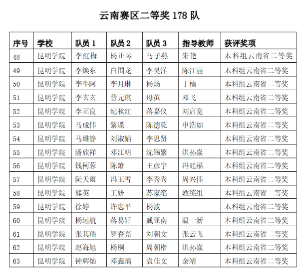 近日,云南省大学生数学建模竞赛组委会发文公布了“2022高教社杯全国大学生数学建模竞赛”获奖名单,beat365参赛的129支队伍中有50支队伍获奖,其中,信息工程学院杨文博、汤淑艳、胡建金三位同学在邱莎老师指导下获得全国二等奖。