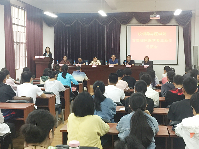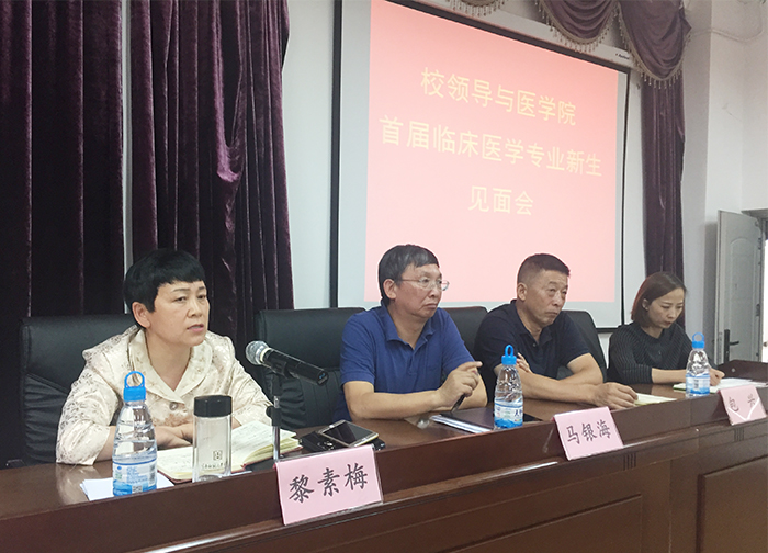 9月4日,黎素梅校长,马银海副校长,教务处、学生处、招生就业处包兴处长、校办等部门负责人到医学院参加beat365官方网站首届临床医学专业新生见面会。医学院班子成员、教研室主任、班主任、部分教师代表和临床医学专业全体44名新生参加了见面会。见面会由医学院院长余珊主持。