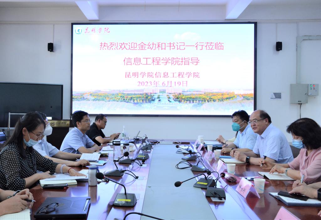 金幼和要求,信息工程学院要把培养高素质的应用型人才放在首位,聚焦“专精特新”现代产业学院建设,加强统筹谋划,理清工作思路、明确发展目标和定位,努力办出特色、形成优势,取得实效。要进一步推动学科交叉融合,围绕学科专业建设和社会经济发展所需,充分运用大数据理念、技术和资源,积极探索“互联网+”,实现学科优势在不同领域的融合发展。要坚持以学生为中心的工作导向,围绕学业发展、高质量就业、创新创业等深化育人育才,做细做实学生管理和服务工作。