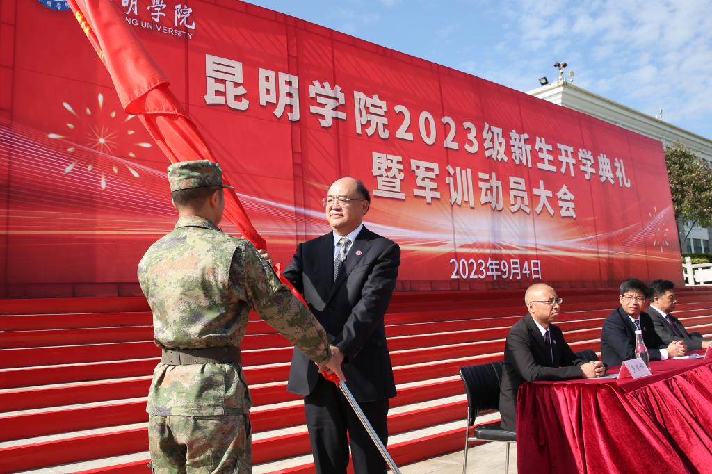 会上,金幼和书记为beat365官方网站2023级新生军训团授旗,军训团团长接旗。