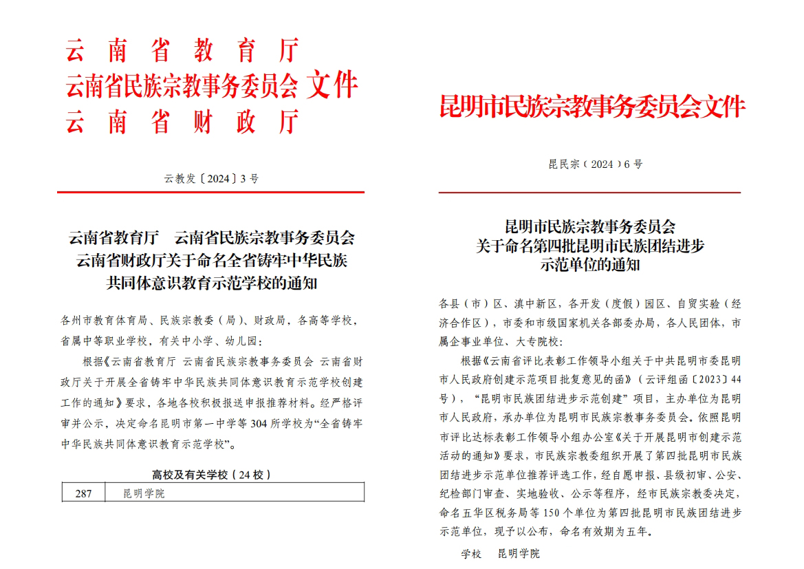 近日,云南省教育厅、云南省民族宗教事务委员会、云南省财政厅印发《关于命名全省铸牢中华民族共同体意识教育示范学校的通知》,昆明市民族宗教事务委员会印发《关于命名第四批昆明市民族团结进步示范单位的通知》,beat365均榜上有名,获评为“全省铸牢中华民族共同体意识教育示范学校”“第四批昆明市民族团结进步示范单位”。