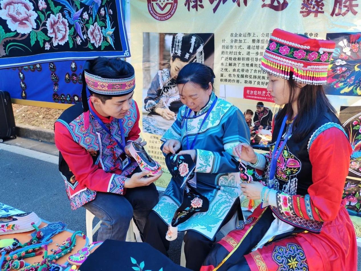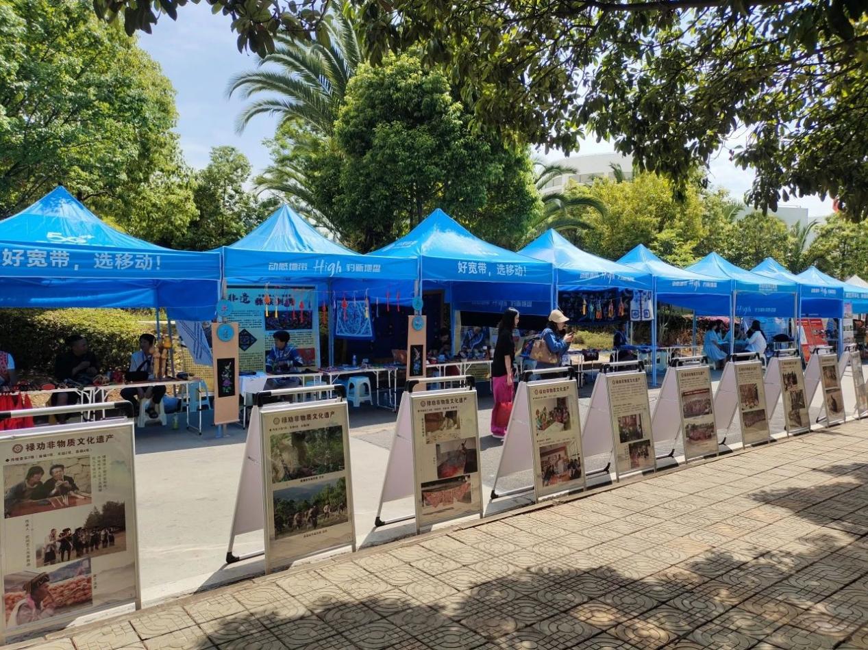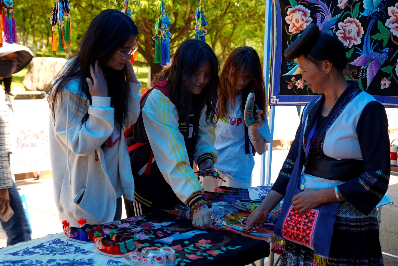 当天,学校青年中心设置了非遗、文创和特色旅游商品展示区,吸引众多师生前来参观。极具民族特色的彝绣、苗族蜡染、手工银饰等精品文创产品和小葫芦笙和口弦乐器展示深得大家的喜爱。中屏火腿、转龙小米糖、轿子山泉、则黑苹果等农特产品琳琅满目,更是引得师生们驻足品尝,纷纷点赞。