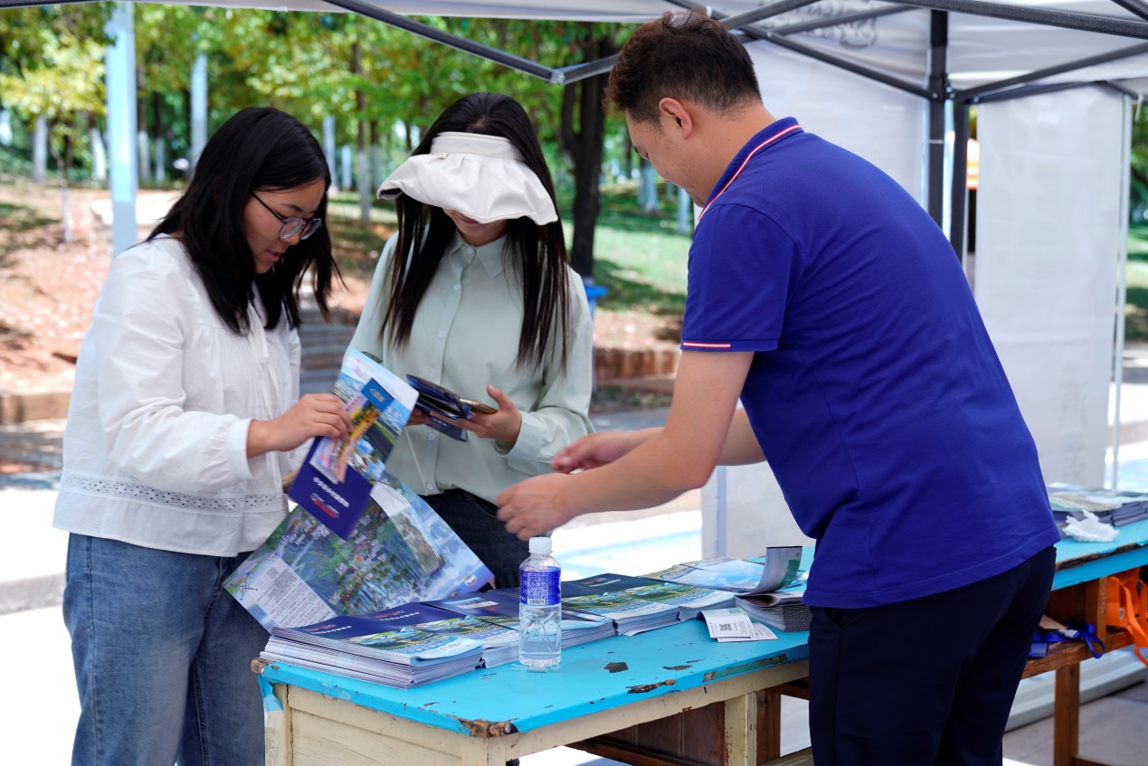 在旅游产品推介展位,工作人员向大家热情发出邀请,欢迎师生们到禄劝品尝禄劝地道美食,领略禄劝壮丽风光,感受禄劝民俗文化。禄劝作为昆明市北部县区自然野趣游重点目的地,自然景观引人入胜,全国纬度最低的季节性雪山轿子山景区雄冠滇中,平安福乡村露营地、原始部落野温泉环抱各类特色、休闲度假酒店;金沙江皎平渡渡江遗址、普渡河铁索桥、红军烈士洞等红色遗迹,全面串联起红军长征两次经过禄劝时的重要活动节点,特色鲜明的红色旅游精品线路,让人立体式感受革命先辈的铮铮情怀,从历史的篇章中感悟初心和使命。这里历史文化与绿色生态浑然一体,优美风景与民俗风情相映成趣,文化旅游魅力熠熠生辉。
