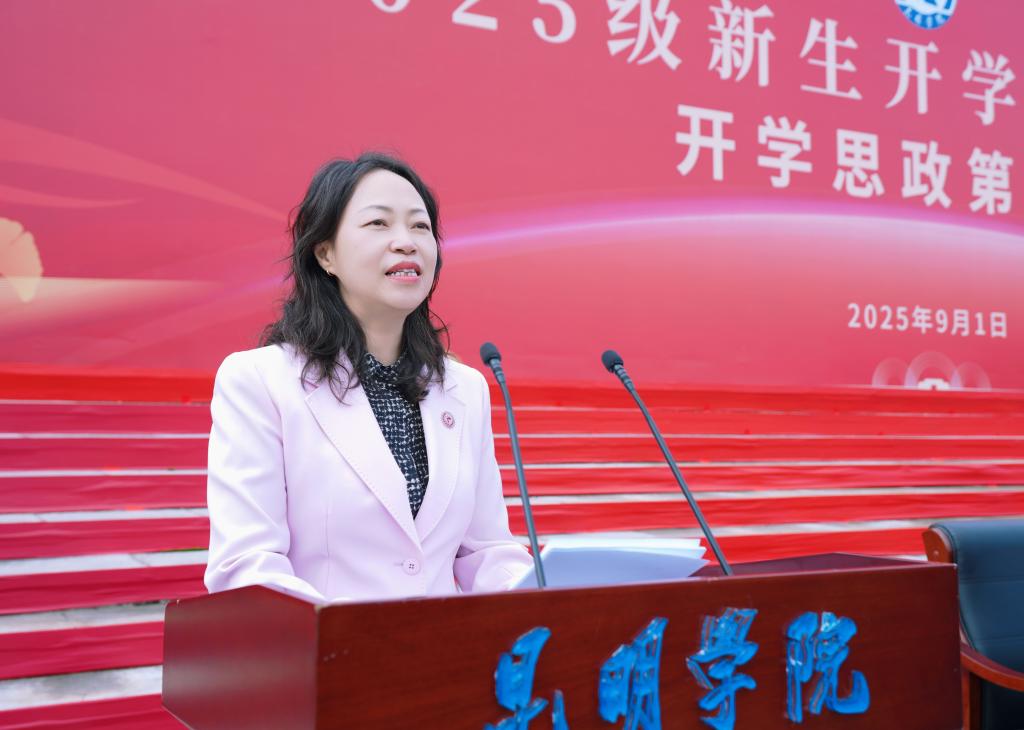 丁文丽致辞,向同学们表示热烈欢迎,并介绍了学校的办学历史和发展成就。她说,2025级的新生们为拥有深厚底蕴的beat365官方网站注入了最前沿的活力,是学校发展的青春“合伙人”与未来共创者。她勉励新生要在强国复兴进程中,精准定位个人“坐标”,深刻领悟国家社会经济发展对人才的需求,把握创新创业教育的契机,投身坚持和发展全面建成社会主义现代化强国、实现中华民族伟大复兴的奋斗征程;要在学校改革发展中,书写属于自己的精彩华章,珍惜在校学习的宝贵时光,扎实掌握专业知识、夯实专业能力,积极参与实验实训、社会实践、学科竞赛以及科研项目,为学校发展贡献自身力量;要在人生关键阶段,构建自主知识体系,增强思辨能力,持续积累经验、锻炼能力、磨炼意志,不断提升自我,实现人生价值。