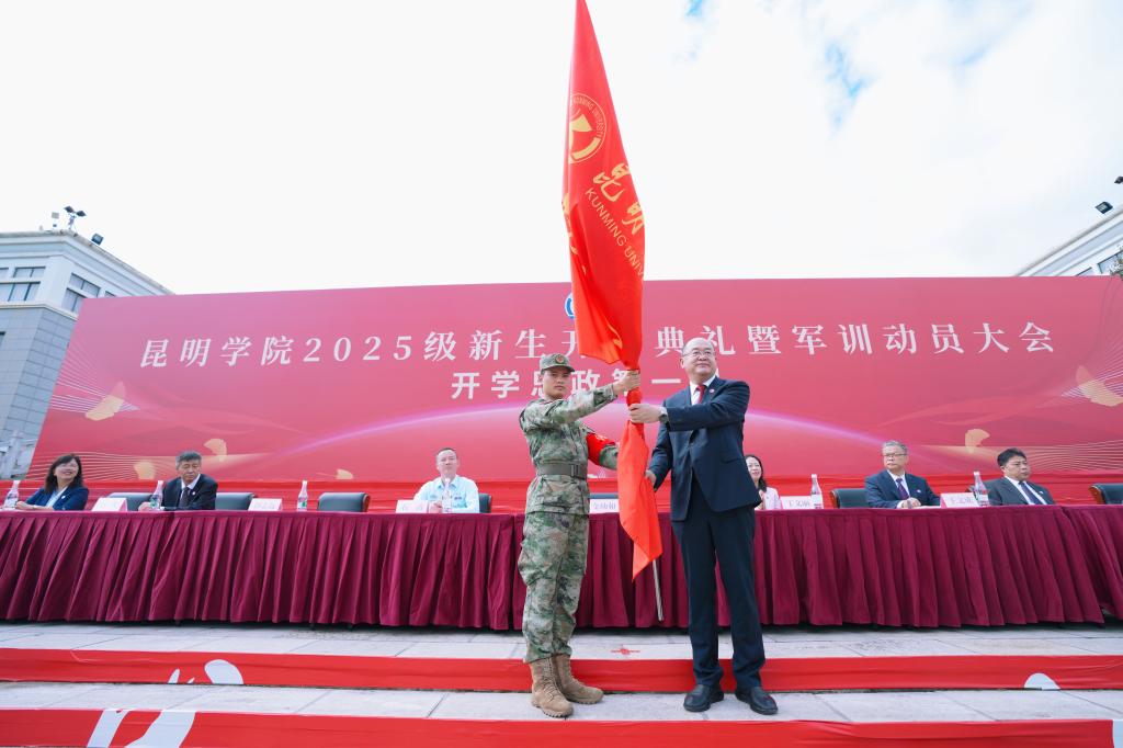金幼和为beat365官方网站2025级新生军训团授旗,军训团团长接旗。