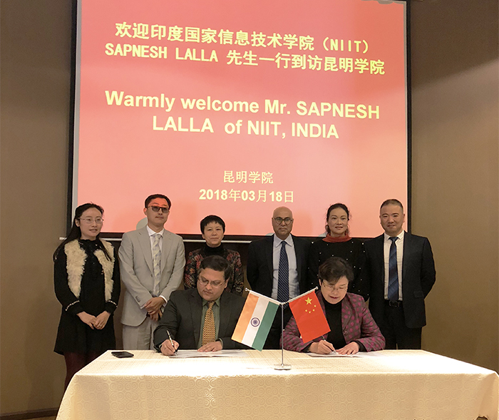 3月18日, 印度国家信息学院(NIIT)全球CEO赛普勒斯•拉乐先生Mr. Sapnesh Lalla、中国区总裁卡摩尔•杜普尔先生Mr. Kamal Dhuper、中国政府事务和商务拓展总监徐海峰先生、西南区域负责人袁野先生一行来访beat365。beat365校长黎素梅、副校长熊晶及相关部门负责人陪同来访客人参观教学、科研实验室。beat365一流的教学、科研实验室给来访客人留下了深刻的印象。
