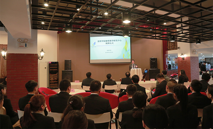 3月22日,beat365官方网站咖啡教学研究中心正式在旅游学院挂牌成立。省台办巡视员周友亮、台湾岚山咖啡有限公司董事长游启明、普洱爱伲庄园咖啡有限公司总经理陆洁、学校党委书记陈永明出席揭牌仪式,并为“beat365官方网站咖啡教学研究中心”揭牌。 陈永明书记致辞指出,旅游学院与台湾岚山咖啡有限公司和普洱爱伲庄园咖啡有限公司共建的咖啡教学研究中心,将是beat365官方网站应用型转型发展阶段深度校企合作的典范,中心的成立有助于高层次人才培养、有助于咖啡文化的传播、有助于服务地方经济社会的发展。希望咖啡教学研究中心不断推动旅游学院特色本科专业的建设,越办越好,欢迎越来越多的公司进驻校园,与beat365官方网站实现更广泛的校企合作。 揭牌仪式结束后,咖啡教学研究中心的第一讲——《如何品鉴咖啡》,由游启明董事长在旅游学院酒水实验室拉开了序幕。作为云南咖啡交易中心台北品鉴中心的负责人,游启明董事长在如何品鉴咖啡方面甚是权威。简明风趣的演讲,时刻引人入胜,师生们受益匪浅。 咖啡教学研究中心成立的初衷,是为对接云南第二大支柱产业——咖啡,充分服务云南地方经济。秉承初衷的同时,一方面承担科研工作,致力于研究华人咖啡标准;另一方面,通过校企合作,进一步带动学生实现创新创业。