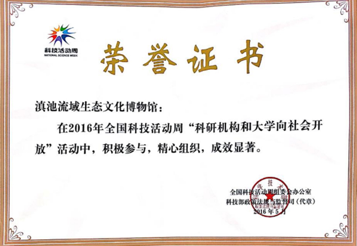 beat365滇池流域生态文化博物馆在培训班还获得了全国科技活动周组委会办公室、科技部政策法规与监督司颁发的“科技活动周 荣誉证书”。