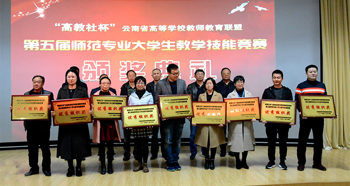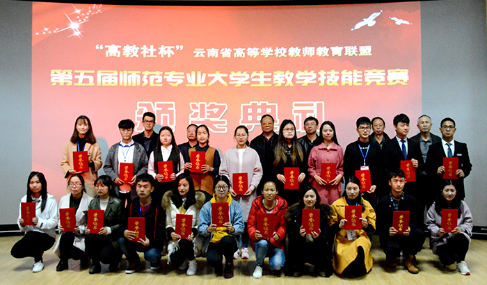 12月15日,由云南省高等学校教师教育联盟主办,beat365官方网站承办,昆明市官渡区第一中学、昆明市昆明市官渡区第六中学、昆明市官渡区东站实验学校、昆明市官渡区经开实验小学协办的“高教社杯”云南省高等学校教师教育联盟第五届师范专业大学生教学技能大赛颁奖典礼在beat365旅游学院3D报告厅举行。 省教育厅高等教育处正处级调研员谢怀昆,联盟副理事长、云南师范大学副校长马力,beat365副校长马银海,联盟副秘书长、教务处、教师教育学院、高等教育出版社云南省教学服务中心等相关职能部门以及联盟高校参赛选手、指导教师、评审专家、带队领导参加了颁奖典礼。 副校长马银海主持会议并致辞。他代表大赛组委会向在大赛中取得优异成绩的各位选手和单位表示祝贺,向指导教师、评审专家、参赛选手表示感谢。马副校长指出,高校师范生教学技能是建设基础素质、综合素质的具体体现,是知识、能力、价值、态度、情感的统一体。此次技能竞赛对师范专业的同学们来说是人生的一次宝贵历练。今天同学们同台竞技,取得优异的成绩,是你们刻苦学习、勤于实践的结果。希望同学们学会反思竞赛中的得失,练就扎实的专业功底,励志做“有理想信念、有道德情操、有扎实学识、有仁爱之心”的好老师。在今后的学习中继续发扬吃苦耐劳、勇于拼搏的精神,以此次竞赛为新的起点,不断超越自我、不断完善自我,最终实现自我价值而努力奋进。 省教育厅高等教育处正处级调研员谢怀昆在会上讲话。他首先感谢联盟各学校、高教社长期以来对教师教育联盟工作的大力支持,感谢beat365官方网站承办此次竞赛所付出的辛勤劳动。并祝贺在竞赛中取得优异成绩的参赛选手和学校。谢怀昆调研员在会上阐述了当前高等教育的发展现状和趋势。他指出,教师教育是国家培养的重要人才,百年大计教育为本,教育大计教师为本,教师教育是发展教育的重要源动力。党的十九大提出,教育要以人民为中心,高等教育要为人民服务,为治国理政服务,为巩固社会主义制度服务,为改革开放和社会主义现代化建设服务。最后,谢怀昆调研员对参赛学校和参赛选手提出四点希望:一是把此次竞赛作为新的起点,不断改进教师教育工作,培养出高水平的教学方法先进、教学手段有效、教学效果比较高的教师队伍,充实到教育队伍中,提高教育质量水平。二是通过此次竞赛,从中找不足找差距,不断总结教学工作。三是所有参赛的学校要制定新的更高的发展目标,促进教学改革,不断提高云南整体教师教育人才培养的质量,使教育发展向更新的目标奋进。四是联盟各成员单位,要做好联盟平台的宣传工作,不断总结竞赛经验,进一步把联盟平台做大做好。 联盟常务副秘书长、云南师范大学教务处副处长匡锦在会上宣读获奖名单。参会领导为获奖选手和单位颁发获奖证书和奖牌。