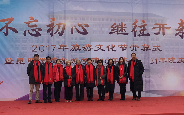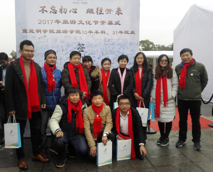 11月24日,旅游学院在beat365聂耳广场举办了主题为“不忘初心、继往开来——2017旅游文化节暨beat365官方网站旅游学院10年本科、31年院庆”的开幕庆典活动。 出席开幕式的有beat365副校长熊晶,历届老领导,校企合作专场招聘会40余家代表,历届校友400余名、在校学子500余名共襄盛举。本次活动由2000级校友现任云南交通之声主播罗西主持。 开幕式上,熊晶副校长代表学校致辞,并向各位来宾介绍了beat365官方网站近几年的发展和旅游学院的情况。院长田芙蓉代表旅游学院全体师生欢迎校友们回家并表达了成立校友会的愿望,她相信在校友们的支持下,旅游学院在未来的征程中会取得更大的发展。 1995级学生代表朱江代表95级的校友向学院赠送礼物,感恩母校的教育之情。2003级的毕业生班先海、雷翔等校友表演了花式调酒。校友情、师生情感动着每一位在场的嘉宾。