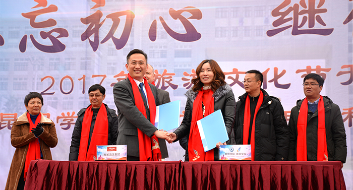 云南康纳雷克集团公司董事长徐世东先生在开幕式上向旅游学院捐赠创新创业扶持基金100000元。希望在校学生认真钻研专业、刻苦学习,借助优良平台,鼓励在校学生早日实现创业梦想。 在澳大利亚贸易委员会商务参赞Jeff• T和熊晶副校长的见证下,旅游学院与雅阁酒店集团签署合作备忘录,自此雅阁酒店集团成为继洲际、希尔顿和万豪之后与旅游学院深度合作的第四家全球酒店管理集团。 开幕式结束后,在旅游学院3D报告厅召开了校友会成立大会,讨论通过了校友会章程议案,选举产生了校友会第一届理事会成员。同时,在聂耳广场举办了旅游学院2018届毕业生就业工作专场招聘会,会场有来自云南旅游、酒店、会展、餐饮行业的众多知名企业40余家单位到场,旅游学院全体毕业生参加了面试。
