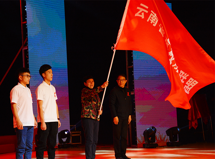 两个精彩的节目之后,云南省预防艾滋病宣传员刘伟带领青年志愿者代表们上台宣读了“云南省高校防艾联盟倡议书”。来自不同高校的同学以及青年志愿者们郑重地宣读“云南省高校防艾联盟”倡议,表明青年们防治艾滋病和追求健康美好生活的决心。 云南省教育厅赵德荣副厅长为beat365官方网站授“云南省高校防艾联盟”旗,beat365官方网站黎素梅校长接旗。