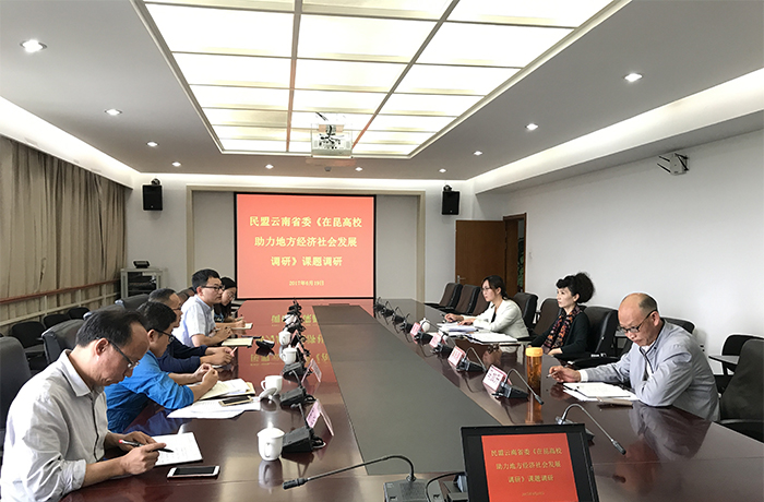 6月19日,经云南省教育厅办公室协调,民盟云南省委《驻昆高校服务地方发展对策研究》课题组长、昆明市政府研究室副主任、民盟昆明市委常委陈垠宏带领课题组成员昆明市政府研究室社会处曾彧,民盟昆明市委专委办主任涂滇云一行到beat365官方网站调研。beat365统战部长蔡华仙、昆明发展研究院长吴瑛、外合作与扶贫办公室主任马加升、民盟beat365官方网站总支主委郭鹏群、常务副主委陈锐参加座谈。