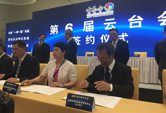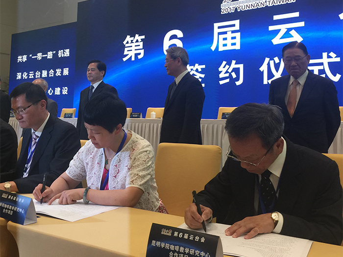 在中共中央台湾工作办公室、国务院台湾事务办公室主任张志军,海峡两岸关系协会会长陈德铭;中共云南省委书记、省人大常委会主任陈豪,省委副书记、省长阮成发;中国国民党副主席林政则,台湾三三企业交流会会长江丙坤各位领导的见证下,黎素梅校长代表beat365官方网站和台湾岚山咖啡公司董事长游启明先生签署了建立“咖啡教学研究中心”的协议。