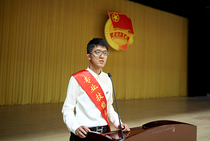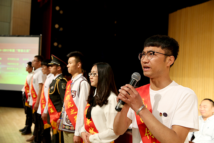 团员代表、专业技能之星王嘉曦同学发言。从专业学习、社会实践、创业创新等方面,分享了自己的学习成长经历。讲述了他在校期间美术作品获得国家级奖项8次、省级和校级奖项19次、留校收藏作品10幅,荣获了第十二届云南省大学生年度人物、连续三年获beat365官方网站三好学生、2015年获得中国美术学院社会美术水平考试山水8级证书、2017年获国家奖学金等12项荣誉称号。同时他在大一学年就举办美术作品联展,四年来坚持手绘beat365官方网站每一处风景的明信片,运用创新创业实践与同学共同开了淘宝店。他用自己的经历告诉我们要珍惜青春、努力学习、回报父母、奉献社会。