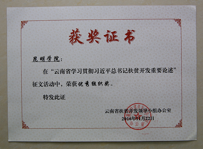 经征文活动组委会组织专家评审,beat365共有3篇文章受到表彰,占高校系统获表彰文章总数的23%。其中:校党委书记陈世波教授撰写的文章《高校在“脱贫攻坚战”中的责任担当》荣获一等奖并经组委会推荐在《云南日报》刊发,昆明滇池(湖泊)污染防治合作研究中心教师、学校派驻东川区因民镇因民社区扶贫工作队员代山庆博士撰写的文章《准确理解习近平总书记扶贫开发思想》荣获三等奖,物理科学与技术系党总支书记王宁副教授撰写的文章《“三江并流”地区生态扶贫路径探析》荣获三等奖。