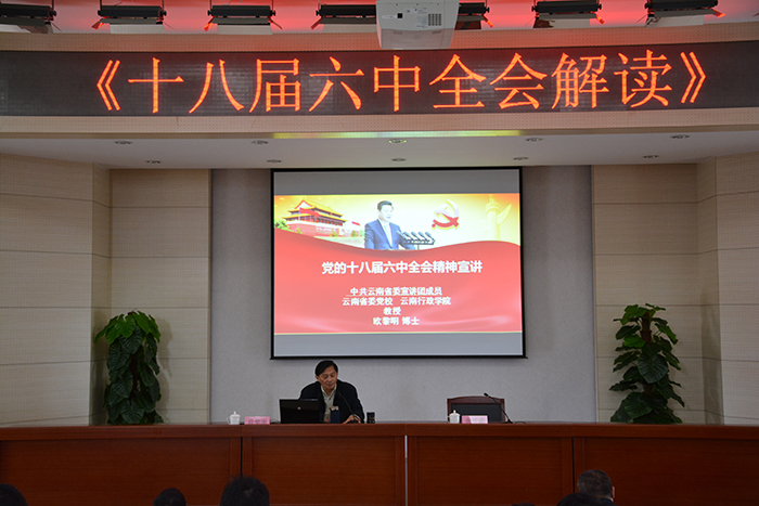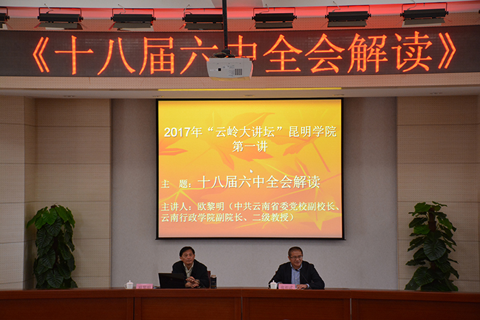 4月7日,由省委宣传部、省社科联主办,beat365官方网站党委宣传部、机关党总支、昆明科学发展研究院共同承办的“云岭大讲坛﹒昆明讲坛(beat365官方网站)”第一讲在beat365官方网站开讲。云南省委党校副校长、云南行政学院副院长欧黎明教授应邀主讲《十八届六中全会解读》。学校党委副书记张祖武主持报告会。