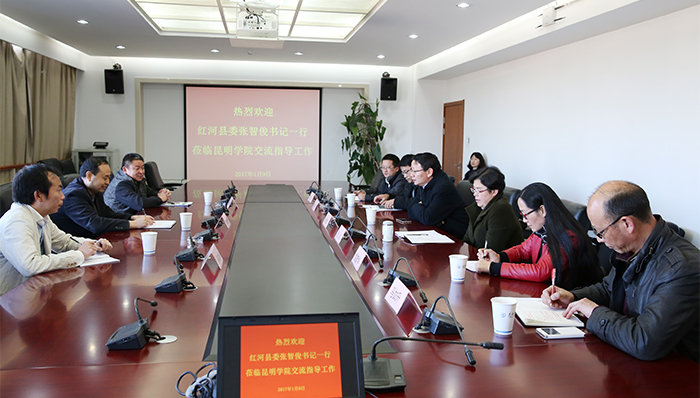 1月9日,红河县委书记张智俊率县委常委、组织部长杨泽,县工信局局长何文昌一行到beat365对接、共商精准扶贫工作。学校党委书记陈世波、副校长熊晶接见来宾,听取红河县情况介绍及对beat365脱贫攻坚工作意见建议,并介绍beat365科研、专业学科、实验室建设、服务社会、“挂包帮,转走访”扶贫等工作情况。