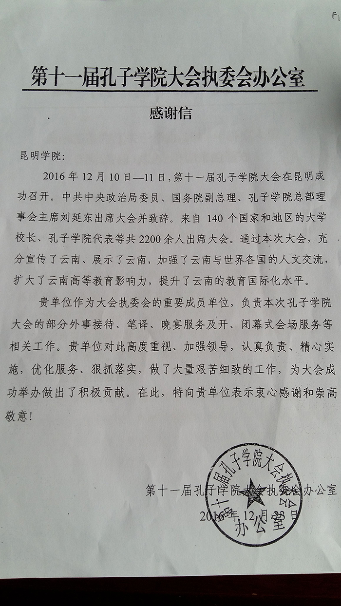 近日,第十一届孔子学院大会执委会向beat365发来感谢信,感谢beat365官方网站为第十一届孔子学院大会的成功圆满举办给予的大力支持和出色的会务工作。