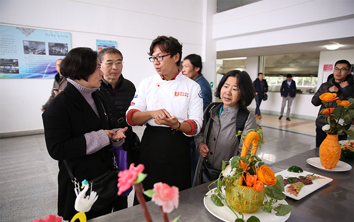 合作协议签字仪式后,来访代表一行在beat365旅游学院院长田芙蓉、党总支书记熊绍宏等负责人的陪同下参观了校园环境建设,深入旅游学院烹饪实训中心、旅游酒水实验室等教学场所进行参观考察,与正在实训的学生进行热切交流,对学生实训作品进行评阅,并在作品前驻足留影。beat365一流的教学设施、特色的餐饮教学赢得代表们赞不绝口,给予一致好评和高度赞誉。