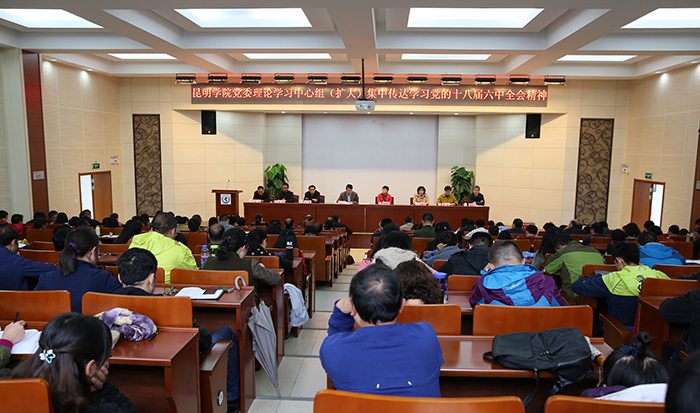 10月31日,在学校党委会第一时间初步传达学习的基础上,学校党委理论学习中心组(扩大)传达学习党的十八届六中全会精神,安排部署学习贯彻落实工作。学校党委书记陈世波主持会议并传达中央《关于认真学习宣传党的十八届六中全会精神的通知》精神,领学《中国共产党第十八届中央委员会第六次全体会议公报》内容,安排部署学校学习贯彻党的十八届六中全会精神的工作。校长黎素梅,党委副书记孙勇、李媛芬,副校长李翔、熊晶、郭华、董建华和党群部门负责人,各院系党政主要负责人和党代表参加会议。