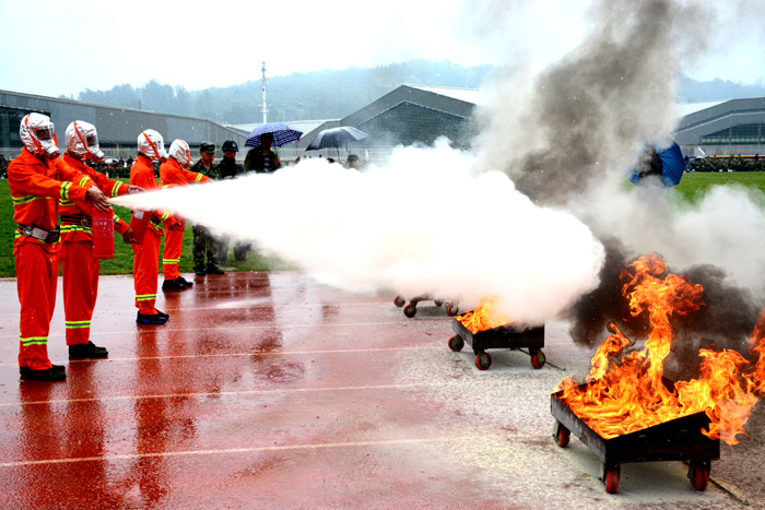 最后进行的是消防演练,一行人戴着防毒面具、身着橙黄色衣服,为我们展示了干粉灭火和消防水带灭烟雾两个项目。
