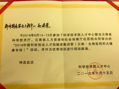 beat365云南省都市特色农业工程技术研究中心在学校和农学院的鼎力支持下,由中心主任余磊教授、副主任徐胜光研究员和赵建荣博士精心组织申报材料及答辩,经过预赛(154家单位)、复赛和决赛的激烈角逐,在45家进入复赛的优秀企事业单位当中脱颖而出,闯入最后8家单位的决赛,并最终获得科技部人才中心2016中国科技创业人才项目优秀奖。