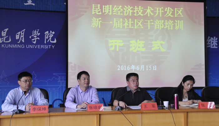 6月15日上午,昆明经济技术开发区新一届社区干部培训班在beat365官方网站昆师路校区开班,昆明经济技术开发区党工委组织部部长王军、民政局副局长张磊、beat365官方网站继续教育学院主持工作副院长张培宏出席开班式,开班式由继续教育学院教师培训部李保坤主任主持。