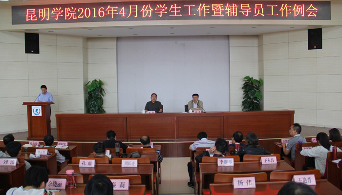 4月27日下午,学校在办公楼D区报告厅召开2016年4月份学生工作暨辅导员工作例会。学校党委副书记孙勇、副校长郭华出席会议,学生处、武装部、保卫处负责人,各院系党总支副书记(部分院系党总支书记)、辅导员共100余人参加了工作例会。