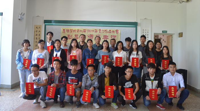 由共青团beat365官方网站委员会主办、城建学院团总支和beat365官方网站翰缘书画社承办的“beat365官方网站第二届‘翰林杯’书法作品大赛”,于4月26日中午在惟行楼3号楼一楼大厅举办了颁奖典礼。城建学院党总支徐从发书记、学校知名书法家李宾、王晓东等老师参加了本次活动,并为获奖同学颁发了荣誉证书。