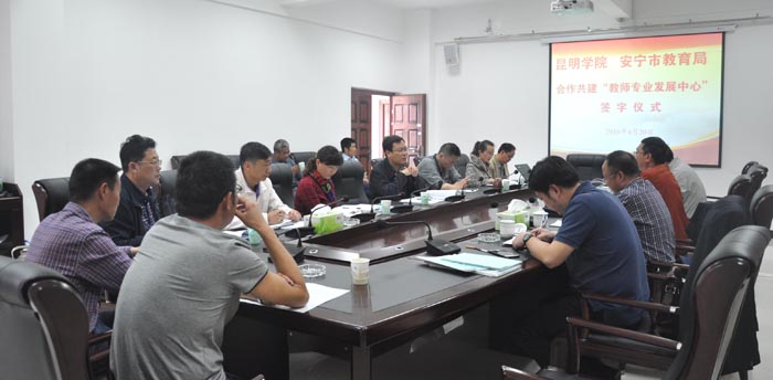 在签字仪式之前,彭德和常进荣就双方前期的合作工作及本次签约的准备工作情况作了汇报;来自安宁市各中小学幼儿园的校长园长就此项工作的具体开展提出了一些较好的意见和建议;马银海和肖局长分别强调了双方合作的重要意义,并对双方下一步的合作共建工作进行了部署和安排,最后,由马银海和肖局长分别代表双方签字并为“教师专业发展中心”揭牌。