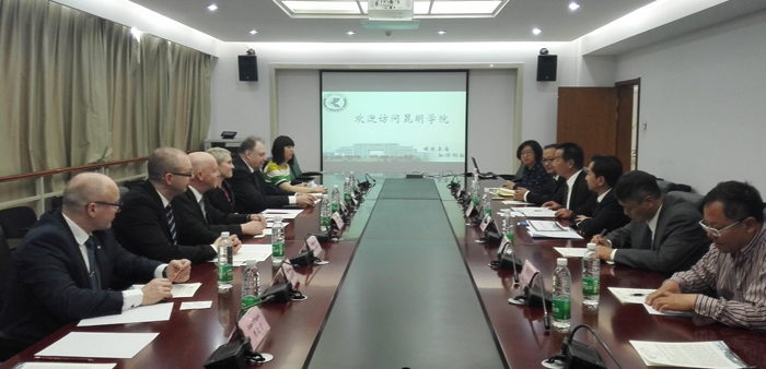 4月8日上午,在昆明市外侨办副主任张晓明等一行的陪同下,芬兰于韦斯屈莱市议会主席保利•帕塔南先生率于韦斯屈莱市董事会主席瑞塔•马克妮女士、于韦斯屈莱市市长蒂姆•科伊维斯托先生、于韦斯屈莱应用科技大学校长尤西•哈尔图宁等一行7人访问beat365。校长何华、副校长李翔、校长办公室主任杨跃、国际交流合作处处长王文君、医学院副院长杨兆宇、医学院副书记罗隽雁及国际处相关人员热情接待并与之会谈。