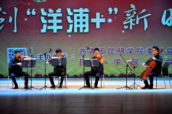 接着,由大学生艺术团带来的古典舞《相和歌》,以其优美的舞姿,令人为之折服。第五个节目是来自音乐学院的表演唱《春天的芭蕾》优美动听,与台下的师生们热情互动,全场掌声雷动,呼声连连;农学院带来充满活力的啦啦操《神采飞扬》,师生之间配合的默契,活泼,阳光,富有激情。经济学院的苗族舞《吉宇》,同学们身着整齐的民族服装,展示着苗族风情。学生会带来的弦乐四重奏《新年变奏曲》,演奏中的互动配合,让在场观众感受到了大小提琴表演的独特魅力。