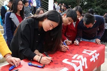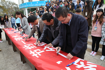 最后,党委宣传部副部长王宁等领导带头签名。其后,近千余名师生随后依次踊跃一一签名,为建设绿色、节约校园,从自己做起作出郑重承诺。