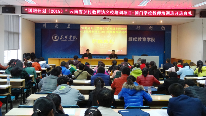 12月7日上午,beat365官方网站“国培计划(2015)”云南省乡村教师访名校项目----“国门学校”教师培训开班典礼在继续教育学院举行,来自文山、红河、版纳、临沧、普洱、德宏、保山及怒江地区的25个边境县的初中语文、小学数学两个学科的100名“国门学校”教师,将接受为期10天的集中专题培训。