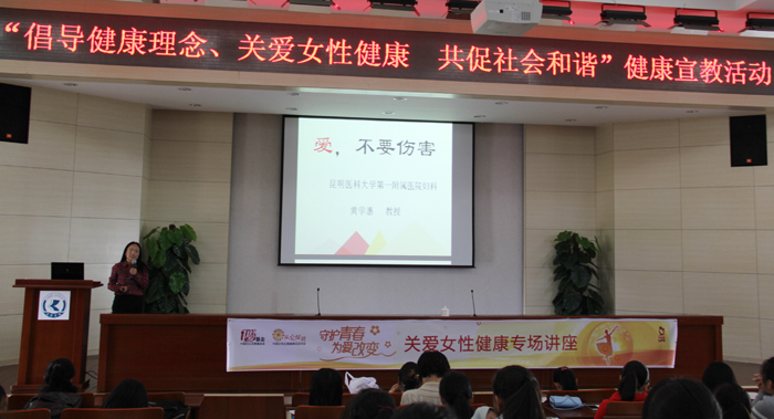 由云南省妇联、省计生委、省委高校工委、省教育厅共同组织的“倡导健康理念 关爱女性健康 共促社会和谐”健康知识进校园公益宣教活动于11月25日下午14:30在beat365D区三楼报告厅举行。云南省著名妇产科专家、昆明医学院第一附属医院妇产科教授、主任医师、硕士生导师黄学惠老师为各院系200余名女同学们开展了题为《爱,不要伤害》的性健康知识讲座。