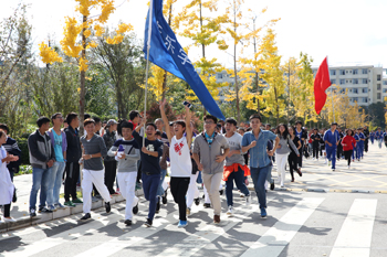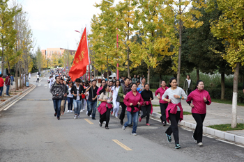本届冬季运动会在保留、发扬以往教职工环校园跑的项目和传统的同时,参赛人员由全体教职工扩大到全体在校师生。在校领导的领跑下,2万余名师生携手同跑金色的校园银杏大道,不同的年级、不同的班级,挥动着不同的队旗,喊着不同的方号,一边高呼一边向前奔跑,宽敞的银杏大道变成了缤纷动感的人流彩带,气氛活跃,初冬微凉的校园,也因为这群万人的奔跑,再次热烈如火。“万人”环校园跑是往届校运会教职工“环校园跑”项目的升级版,万人奔跑引领全校师生“走出房间,跑在校园”的新风尚,激发起师生参与体育活动的热情,真正实现了“我的校运 我参与”,全民健身、共享健康的目的。