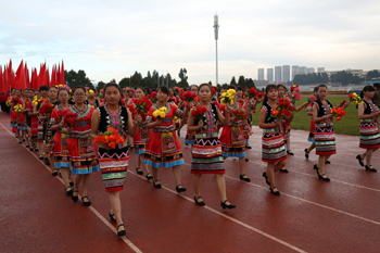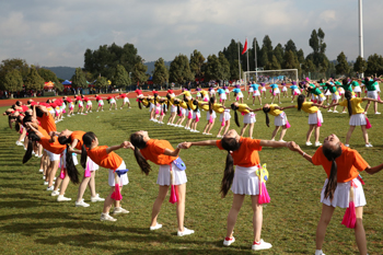 随后,进行了团体操舞蹈表演。由师生共同表演的节奏快、耗体力的《牛仔舞》,舞步敏捷、跳跃,舞姿轻松、热情、欢快,展示了师生青春、刚健、浪漫、豪爽的气派;外国语学院与信息技术学院共同献上的《如花绽放》,演译了beat365官方网站蓬勃发展历程和成就,意示昆院美好明天;数学系和物理科学与技术系共同展演的《舞动青春 运动昆院》,诠释了体育精神内涵和师生团结奋发向上的精神;教师教育学院亮相的《色彩青春》,再现了大学生活的多彩青春与美好未来梦想。节目表演不仅展示了师生体育舞蹈风采,又体现了师生弘扬体育精神和对艺术美的追求。