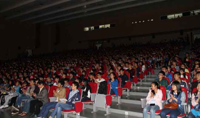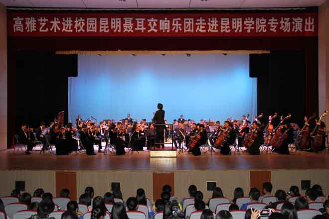10月21日晚,2015年高雅艺术进校园之昆明聂耳交响乐团beat365官方网站专场演出在学生会堂举行。副校长郭华、部分中层干部、各院(系)团总支书记、辅导员、各院(系)师生代表1000余人观看了演出。